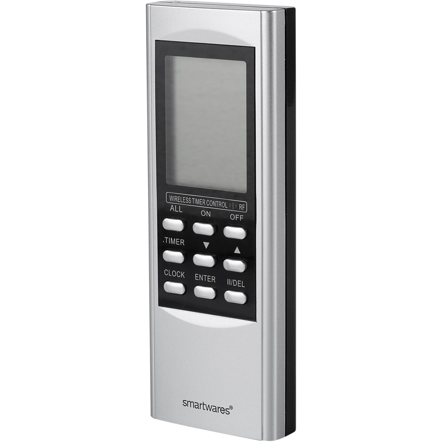 Graumetallic Funkschalter‑Fernbedienung von SMARTWARES mit bis zu 15 Kanälen und Timer‑Funktion – zur kabellosen Steuerung von Lampen und Geräten. Inkl. Batterien, kompatibel mit Plug‑&‑Connect‑Funkschaltern.